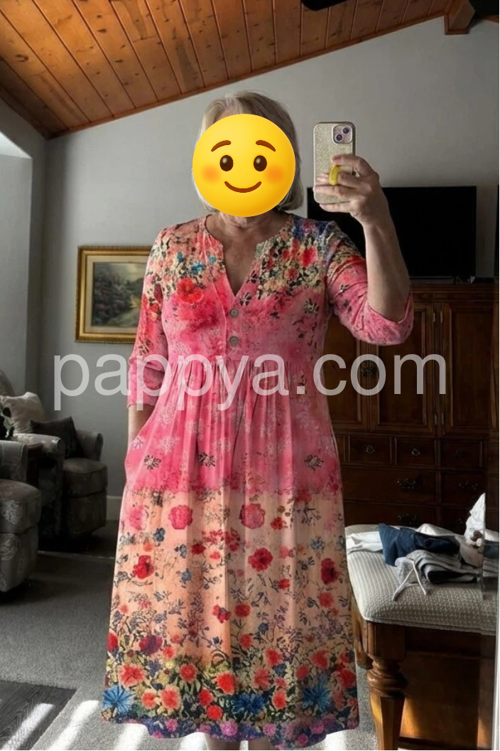 Yes!It runs true to the garment size chart please choose your size based on your measurements.This midi dress features a vibrant floral print with a soft pink gradient and bold blooms. The V-neckline and three-quarter sleeves offer a flattering, relaxed fit. Side pockets add practicality and ease. Flowy A-line silhouette enhances movement. Perfect for garden parties or casual summer days.