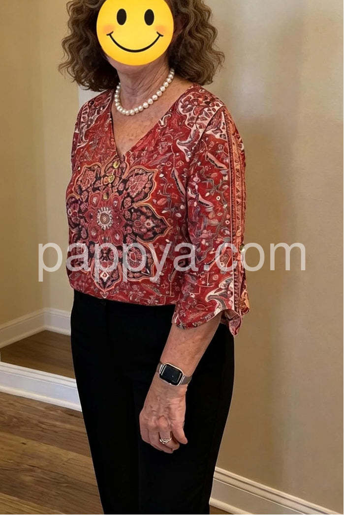 Yes!It runs true to the garment size chart please choose your size based on your measurements.A vibrant bohemian blouse featuring an intricate red paisley print. This elegant top showcases a classic V-neckline adorned with delicate buttons, adding a touch of sophistication. The three-quarter length flared sleeves create a flowy, feminine silhouette, perfect for both casual outings and more dressed-up occasions. Crafted from lightweight, breathable fabric, it ensures comfort all day long.