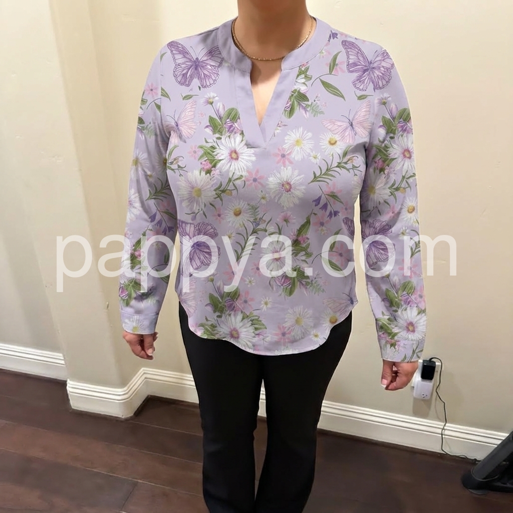 Yes!It runs true to the garment size chart please choose your size based on your measurements.This long-sleeve top features a delicate lavender base with floral and butterfly prints. The keyhole neckline adds a touch of elegance. Lightweight fabric for comfort and breathability. Perfect for spring or casual outings. Pair with jeans or skirts for effortless style.
