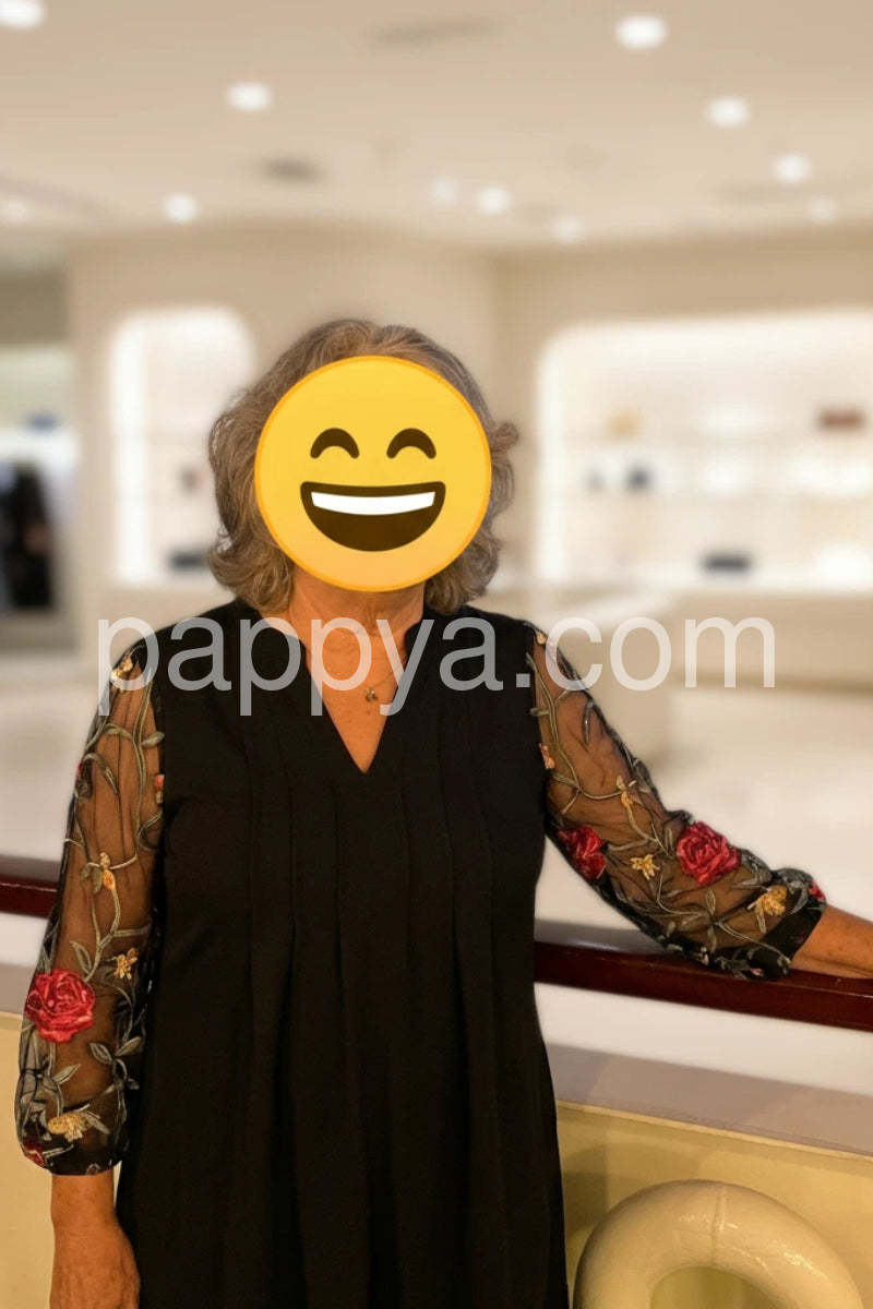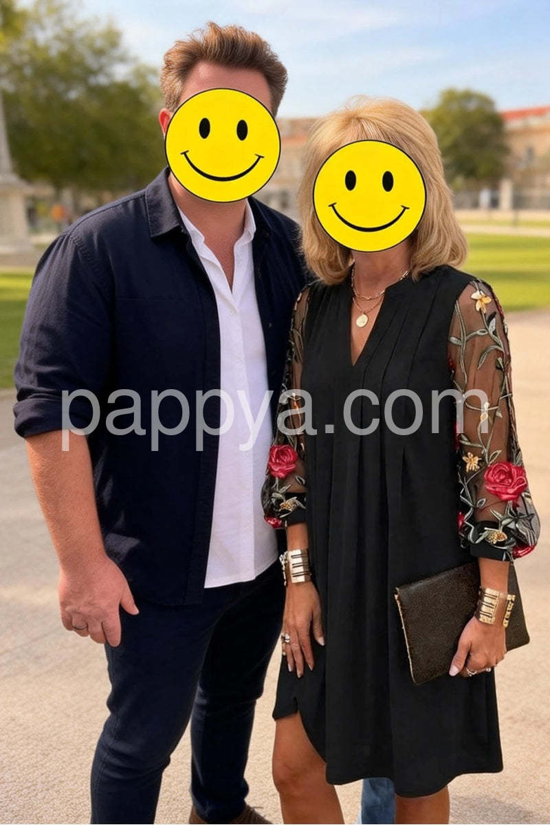 Yes!It runs true to the garment size chart please choose your size based on your measurements.Introducing our newest addition: Elegant V-Neck Sheer Sleeve Mini Dress. This dress features a flattering V-neckline and sheer sleeves for a touch of elegance. Made with high-quality materials and expert craftsmanship, this dress is perfect for any special occasion. Look and feel sophisticated with this must-have dress.